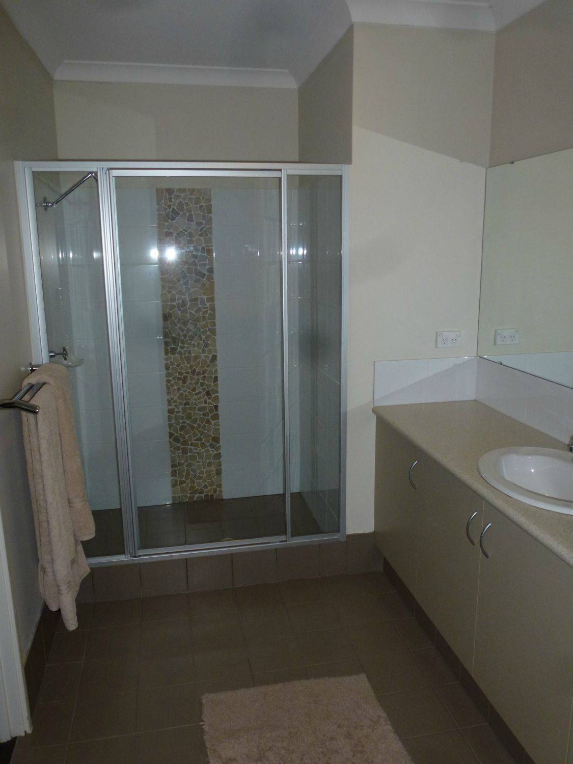 •ensuite consists of a large shower, toilet and large vanity with star lights and heat lamps above;