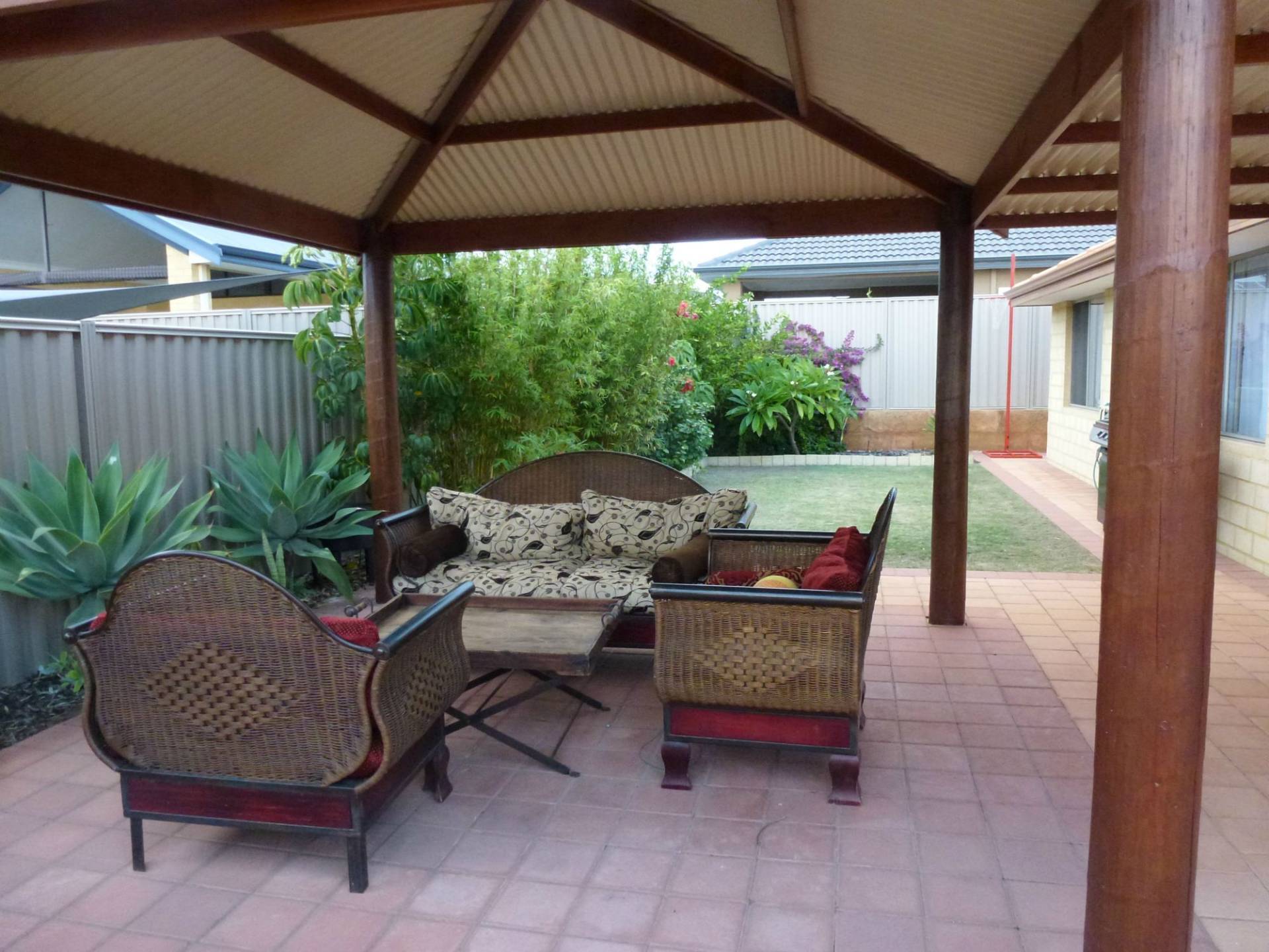 •tropical style pitched gazebo/outdoor entertainment area;