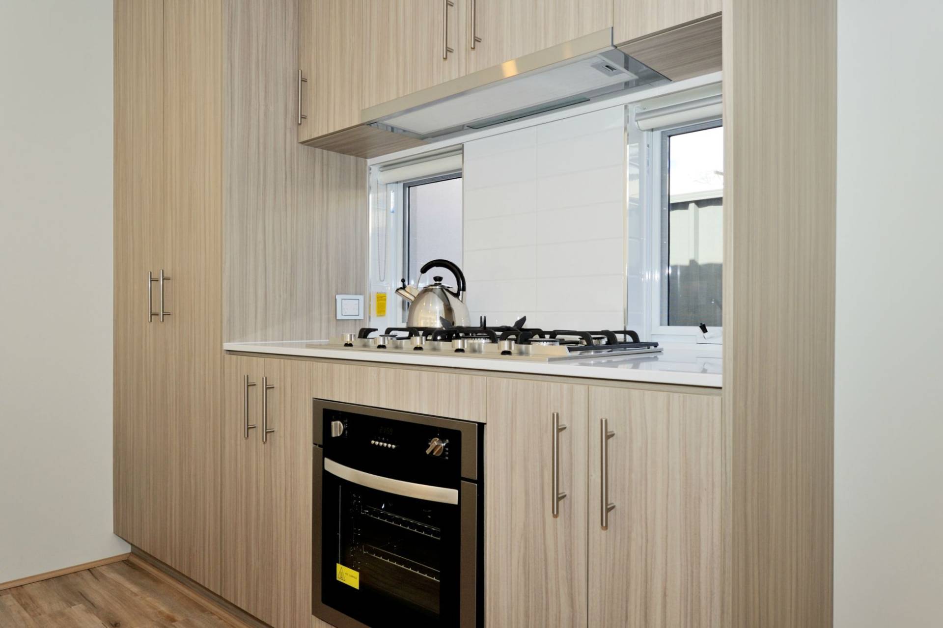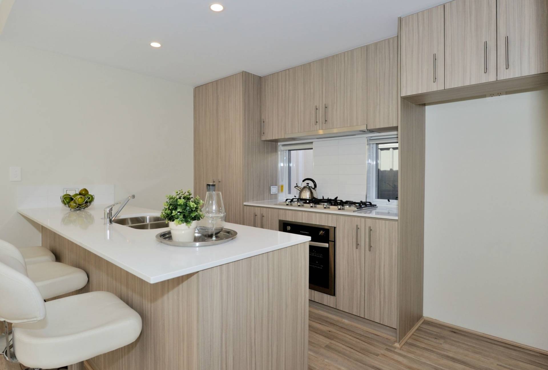 Modern kitchen with Essastone benchtops, Clark double undermount sink, overhead cupboards, soft closing doors and drawers and stainless steel appliances including 900mm gas hotplate