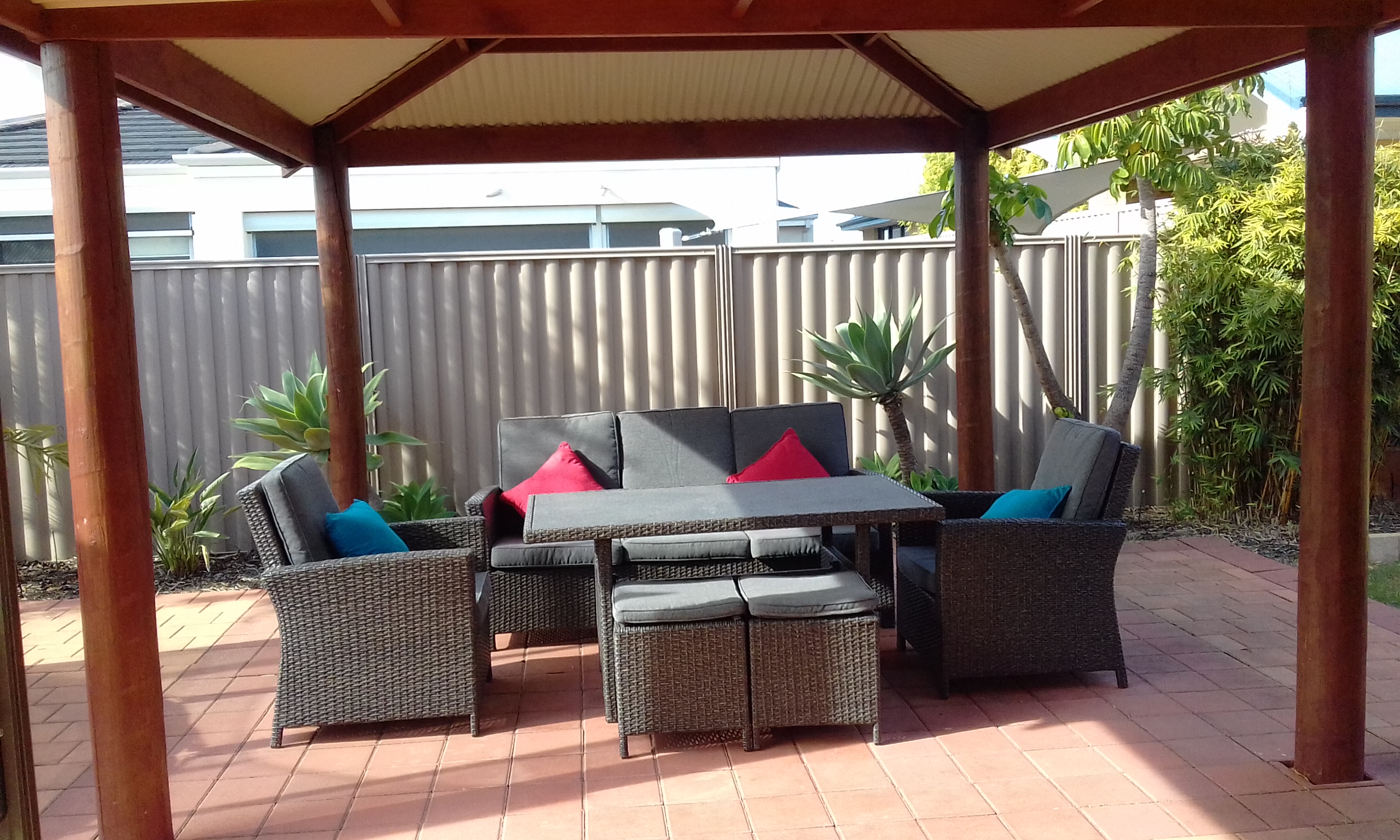 •tropical style pitched gazebo/outdoor entertainment area;